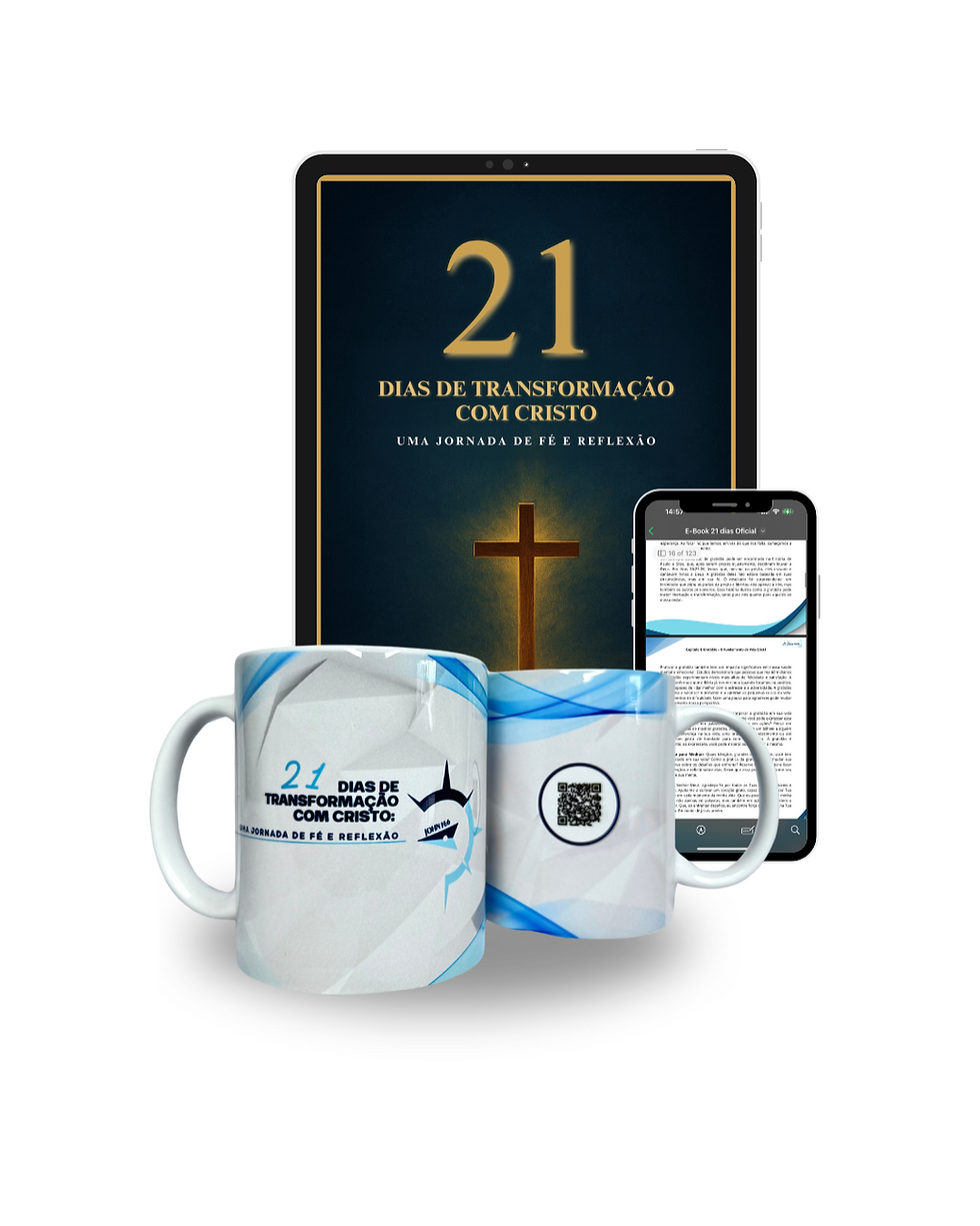 Transforme sua rotina com a caneca exclusiva do livro "21 Dias de Transformação com Cristo"! Além de um design inspirador, essa caneca traz um QR Code especial, permitindo que você acesse o livro digital diretamente do seu celular.